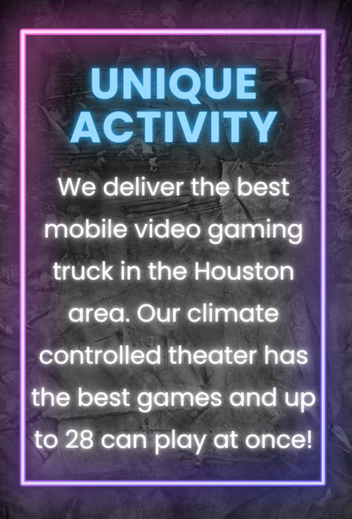 Hire a mobile video game truck experience with Mobiplay Games, and level up on big fun at your your next event. We bring the party straight your home or venue in Sugarland, Missouri City, Stafford, Richmond, Bellaire, Katy, Pearland, Fresno, Houston and surrounding areas. Our Game Coach ensures a seamless, hassle-free video game truck experience from start to finish, focusing on safety, fun, and the latest technology. Don't miss out on the opportunity to elevate your event with THE ULTIMATE MOBILE VIDEO GAME TRUCK EXPERIENCE! Book your event today to help create memories that will last a lifetime!